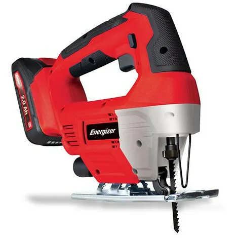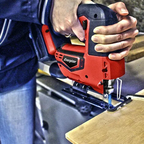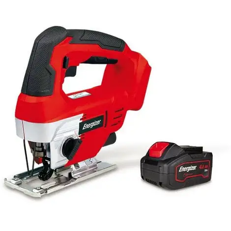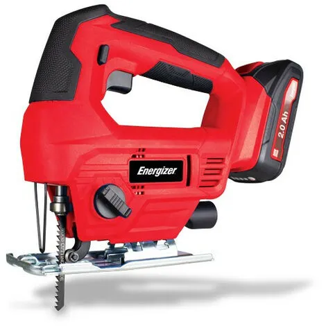 Cette scie sauteuse pendulaire fonctionne sur une batterie au Lithium-Ion de 20 Volts qui est compatible avec tous les outils électroportatifs Energizer de la gamme « 20V Energy »